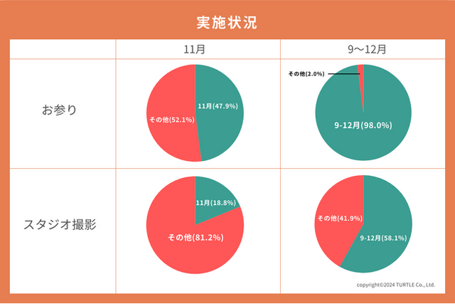 東海地方で20店舗のフォトスタジオを運営する株式会社タートル(本社:愛知県春日井市)は2023年の七五三の写真撮影時期、七五三の写真撮影&お参りが行われている時期に関して、調査を実施しました。調査結果からは、現在は1年を通して七五三の写真撮影が行われていることが明らかになりました。