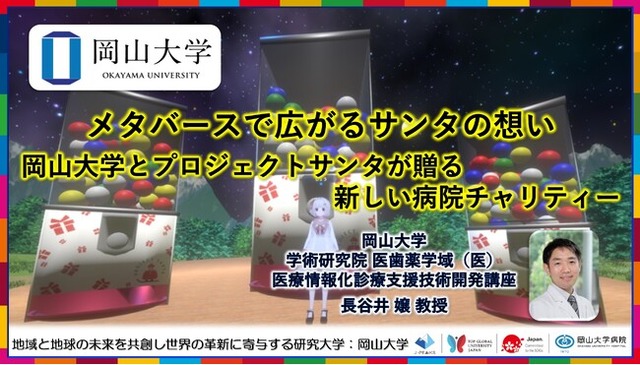 国立大学法人岡山大学(本部:岡山市北区、学長:那須保友)の学術研究院医歯薬学域(医)医療情報化診療支援技術開発講座の長谷井嬢教授(整形外科)は、2023年よりメタバースを用いた革新的な患者支援活動を開始しています。この度、プロジェクトサンタと連携し、メタバース上でガチャガチャを楽しめる新たなプロジェクトを立ち上げました。