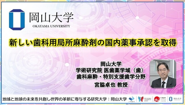 厚生労働省から2024年9月24日付けで、「セプトカイン配合注カートリッジ」が製造販売承認されました(麻酔成分の一般名はアルチカイン)。この製品の審査では、岡山大学学術研究院医歯薬学域(歯)歯科麻酔・特別支援歯学分野の宮脇卓也教授が主導した医師主導治験の成績が臨床での評価に全面的に使用されました。