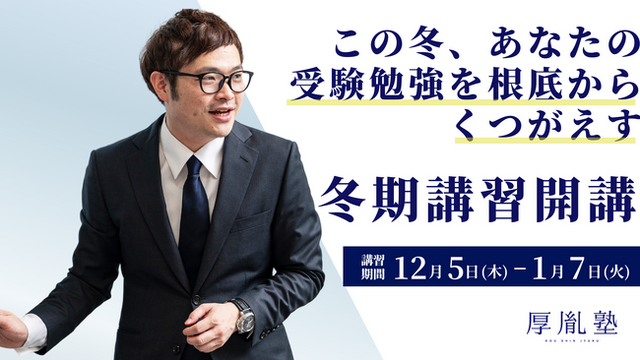 厚胤塾の冬期講習では、学年別に複数の講座を用意し、生徒の目的・目標にあったカリキュラムを提供します。また受験生には共通テスト対策講座などの入試の得点向上に直結する特別な講座を提供し、入試を万全な状態で迎えることができる環境をご用意しております。
