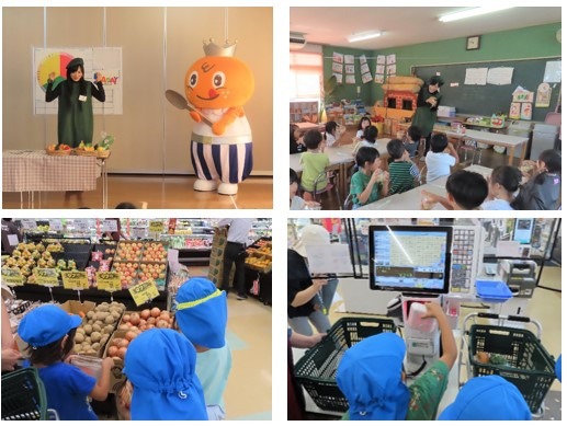また、年長組の園児は最寄りの中央フード熊毛店に移動し、ミッションカードに記載された特徴の野菜や果物を、実際に選んで買い物を体験するという「買い物ミッションゲーム」を実施しました。レジ打ち体験も行い、園児たちは大変楽しそうにゲームに参加していました。今後も当社では、この食育体験ツアーを定期的にさまざまな小学校・幼稚園・保育園で実施してまいります。