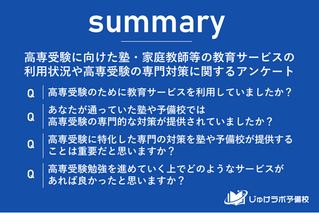 じゅけラボ予備校(所在地:大阪市北区、代表取締役:後藤智則)は、高専(高等専門学校)卒業生261名の男女を対象に、高専受験に向けて塾・家庭教師等の教育サービスの利用状況や高専受験の専門対策に関する調査を実施しました。