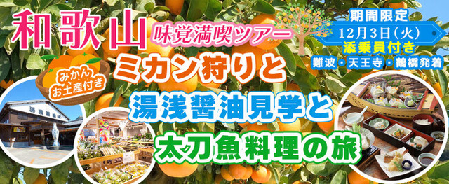 和歌山味覚満喫ツアー:お土産付き!!ミカン狩りと湯浅醤油見学と太刀魚料理の旅12月3日(火) 〈難波・天王寺・鶴橋発着〉お一人様11,300円!〈添乗員付き〉日帰りバスツアーのオンライン販売を開始しました。