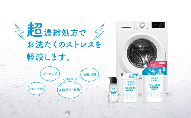2016年の発売当初よりその超濃縮処方を活かしてコンパクトなプッシュ式ボトルをいち早く採用し、片手・ワンプッシュでの洗たく機への投入を可能にしました。無色透明でサラッとした液体は液づまりしにくく、ポンプ部分はバックサクション機能付きで液だれ防止にも配慮しています。