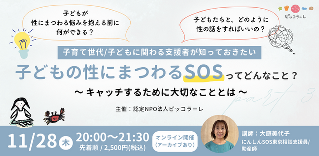 認定NPO法人ピッコラーレ(所在地:東京都豊島区、代表:中島かおり、以下ピッコラーレ)は、子育て世代や子どもに関わる支援者向けのオンライン講座「子どもの性にまつわるSOSってどんなこと?~キャッチするために大切なこととは~」を開催します!