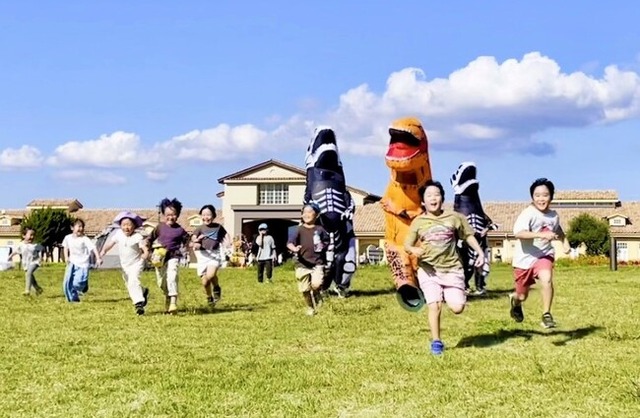 ソレイユの丘で、みんなでティラ活!レース参加の前後の時間には、園内をティラノサウルス姿で遊ぶことも可能。ティラノサウルスの姿でソレイユ園内の飲食店に行くと、いいことがあるかも…?!