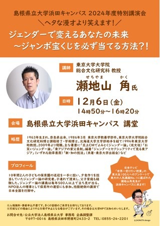 島根県立大学浜田キャンパスは、令和6年12月6日(金)に東京大学 瀬地山角教授による講演会を開催します。一般の方もご参加いただけます(事前申込不要)。多くの皆様のご来場をお待ちしております。