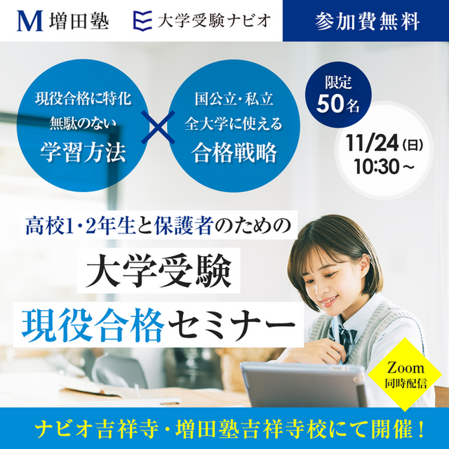 株式会社増進会ホールディングス(Z会グループ)のグループ会社、株式会社栄光(本社:東京都千代田区 代表取締役社長:下田勝昭)が運営する、難関私大文系専門塾「増田塾」と大学受験塾「栄光ゼミナール大学受験ナビオ」は、高校1・2年生と保護者対象「大学受験現役合格セミナー」を2024年11月24日(日)に無料開催します。吉祥寺校での会場参加、もしくはオンライン視聴をお選びいただけます。
