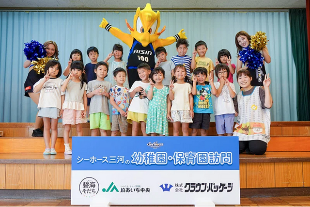 2024年9月24日(火)、シーホースくんとSuper GirlsのMISA、CHISAKIが福地南部保育園(西尾市)を訪問し、園児の皆さんと一緒にクイズやダンスを楽しみました。