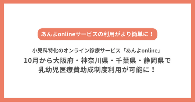 小児科にかかりたい親子と在宅で働く医師をつなぐオンライン診療サービス「あんよonline」を運営するジークス株式会社(愛知県名古屋市、代表取締役社長CEO:村上嘉一、以下当社)は、2024年10月から大阪府・神奈川県・千葉県・静岡県内で乳幼児医療費助成制度の適用が可能になりましたのでご案内いたします。(※)