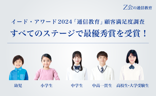 株式会社増進会ホールディングス(Z会グループ)のグループ会社である株式会社Z会は、株式会社イードが発表したイード・アワード2024「通信教育」顧客満足度調査で、幼児、小学生、中学生、中高一貫生、高校生・大学受験生のすべてのステージにおいて、最優秀賞を受賞しました。