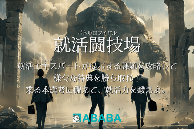 「就活闘技場 - バトルロワイヤル - 」特設サイト(https://skilluparena.ababa.co.jp/)に、就活の課題が就活エキスパートとなり出現しています。好きな敵を選び「課題攻略」に挑んでください。