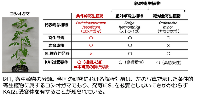 根寄生雑草は、他の植物の根に寄生し、水や養分を寄生した相手から奪いとって生育します。農業被害の報告はないものの、日本においてもヤセウツボという名前の根寄生雑草が観測されています。根寄生雑草の種子は独自の発芽システムを持っており、寄生する相手、すなわち宿主の根から分泌されるSLを感知することで発芽します。これは、宿主に寄生することなくして生育できない根寄生雑草において、極めて重要な生存戦略であると考えられます。これまで根寄生雑草においては、SL受容体として、KAI2dと名付けられた加水分解酵素ファミリータンパク質が同定されてきました。これらの受容体は、発芽にSLを必要とする根寄生植物において、低濃度のSLを感知して発芽するために重要な役割を担っていると考えられます。一方で、条件的根寄生植物であるコシオガマは、ヤセウツボなどの絶対寄生性の植物とは異なり、寄生せずに単独で生育することも可能であり、発芽にSLを必要としないことが知られています(図1)。しかしながら、コシオガマにおいてもKAI2dファミリータンパク質が存在することが報告されており、その機能に関してはほとんど明らかになっていませんでした(図1)。これらの受容体が絶対寄生性の根寄生植物におけるSL受容体と同様に、SL受容体としての機能を有しているのかどうか、また、もしSL受容能を有する場合、その受容体はどういった時にSLを認識して機能するのか、といった点に興味がもたれます。