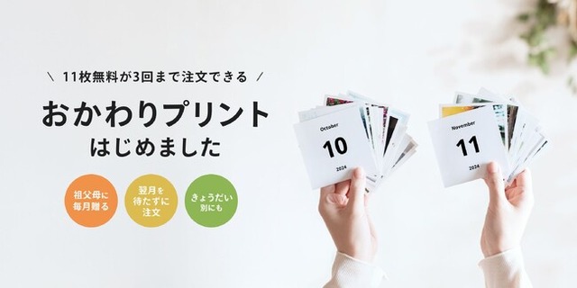 本日11月1日(金)より、毎月11枚無料の写真プリントを月3回まで送料のみで注文可能な「おかわりプリント」としてリニューアルを実施しました。これにより、祖父母へのプレゼントをはじめ、翌月まで待たずにこまめに注文できるほか、きょうだいごとのアルバム作成などにご利用いただけます。さらに、「みてね」で注文をまとめることで、複数サービス併用の手間を省き、写真の選び忘れや重複注文を防ぐことができます。