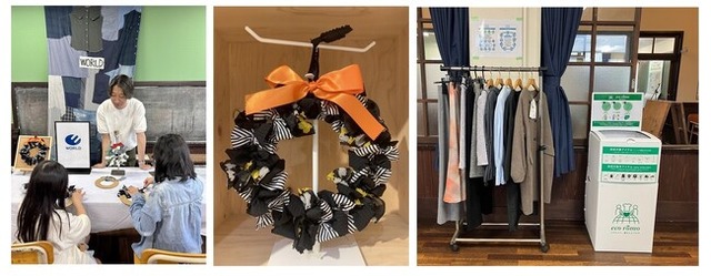 左)ワークショップの様子 中央)ワークショップで作成したハロウィンリース 右)自社開発したサステナブル素材「CIRCRIC(サーキュリック)」を使用したファッションアイテムの展示や衣料品回収を実施
