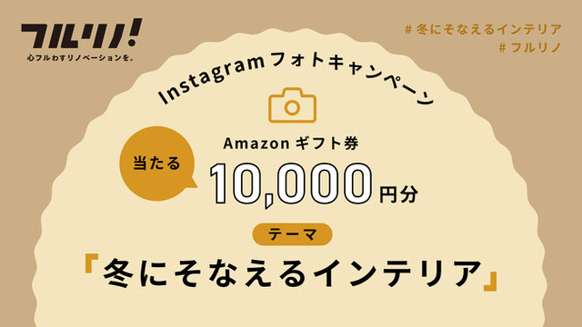 株式会社フルリノ(代表取締役:開原崇友、以下「当社」)が運営する、リノベーション会社を検索するポータルサイト「フルリノ!」は、11月1日(金)より、インスタグラムフォトキャンペーンを実施します。「冬にそなえるインテリア」をテーマに写真を募集し、抽選で5名様にAmazonギフト券1万円分をプレゼントします。