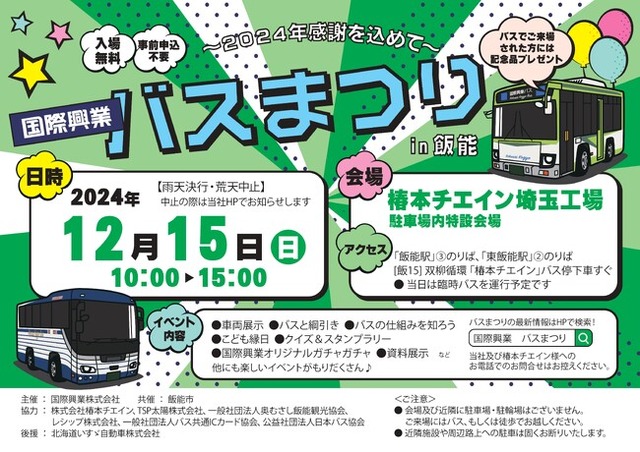 バス・ホテルなどの事業を展開する国際興業株式会社(本社:東京都中央区 社長:黒滝寛)は、12月15日(日)に「~2024年感謝を込めて~国際興業バスまつりin飯能」を開催いたします。会場は前回に引き続き、飯能市内に工場がある株式会社椿本チエイン様にご協力をいただき、「椿本チエイン埼玉工場 駐車場内特設会場」となります。