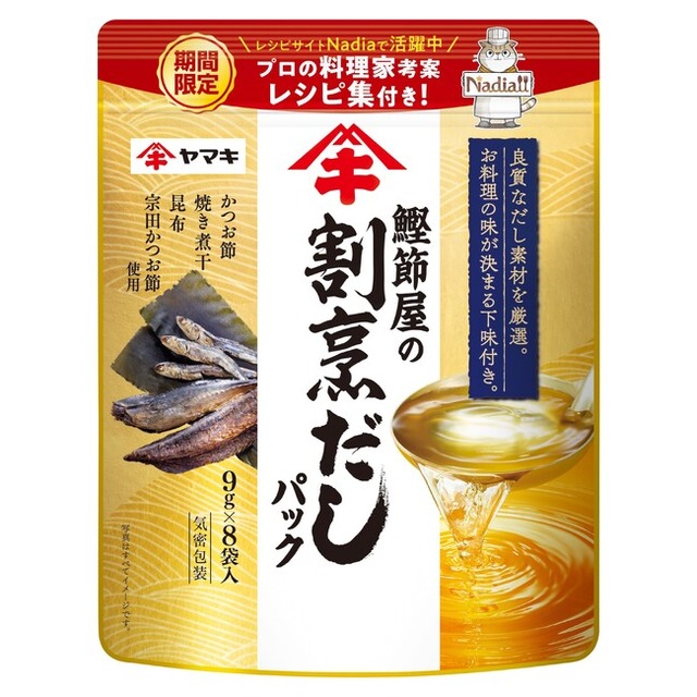 2024年4月にレシピサイトNadiaにて、ヤマキのだしパック商品(鰹節屋の割烹だしパック/鰹節屋のだしパック)を使用したレシピコンテストをそれぞれ開催しました。そして今回、多くのNadia Artistより応募が集まった全348のレシピの中から厳選しレシピ集としてまとめ、そのレシピ集を封入した「鰹節屋の割烹だしパック 8P・20P」が限定発売されます。