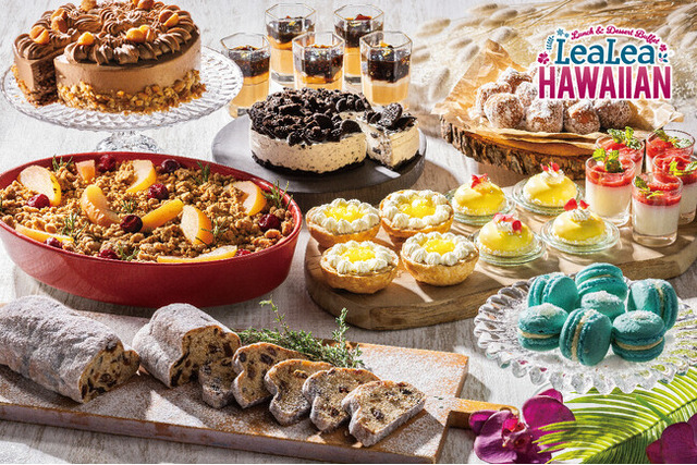 マカダミアンチョコレートケーキ/コナコーヒーのゼリー キャラメルムース/オレオチーズケーキ/マラサダ/焼き林檎のクランブル/ハウピアパイ/トロピカルフルーツのムース/ブラマンジェ ストロベリーソース/シュトーレン/ミニャルディーズ(パインクッキー、マカロン)