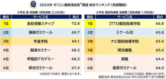 2024年 オリコン顧客満足度(R)調査 小学生 塾 首都圏
