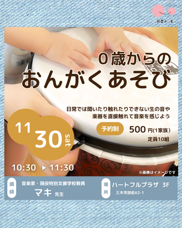特定非営利活動法人ほっぺ(兵庫県三木市・代表:大森 奈津子)は、音楽家・現役特別支援学校教員マキ先生をお招きし、2024年11月30日(土)hoppe(コーベヤスポーツ三木店3階)にて、『0歳からのおんがくあそび♪』を開催いたします。赤ちゃんから参加でき、パパと一緒の参加も多いイベントとなっています。この機会に、親子で生の音や楽器に直接触れ、音楽を感じてみませんか?先着制となっております。ご予約お待ちしております。