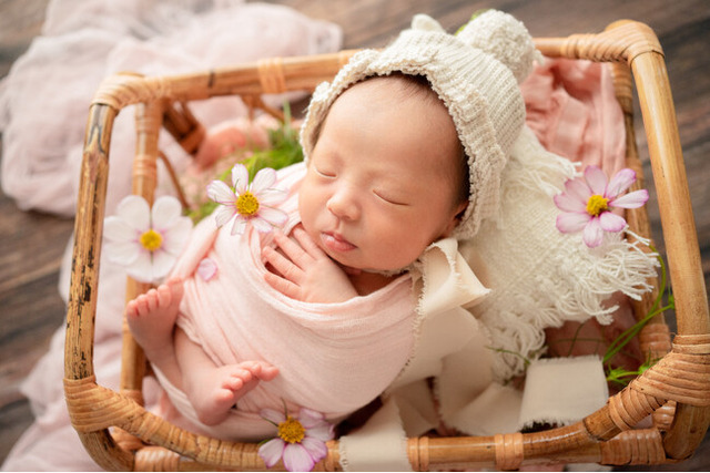 生後2~3週間以内の身体が柔らかく深い眠りに入りやすい時期に、専用のカゴや可愛らしい小物を使って産まれて間もない新生児の尊い姿を撮影するサービスです。