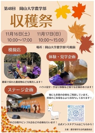 国立大学法人岡山大学(本部:岡山市北区、学長:那須保友)の農学部では、2024年11月16日(土)、17日(日)に、農学部が主体となるお祭り、『収穫祭』を本学津島キャンパスで行います。