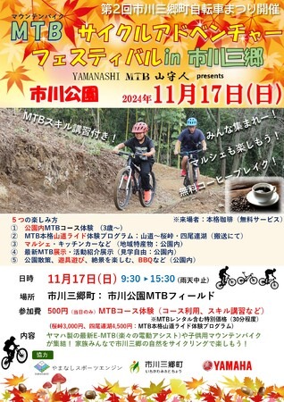 今年の10/6(日)に半世紀の時を超え、MTBフィールドとキャンプ場の機能が大きく加わりリニューアルオープンを果たした山梨県市川三郷町の都市公園「市川公園」にて、誰でも楽しめる自転車イベントを開催致します。自転車イベントではありますが、市川公園内を自由に散策したり、遊具で遊んだり、ピクニックを楽しんだり、マルシェで買い物をしたり、甲府盆地の展望を楽しんだり、様々な楽しみ方ができる環境になっています。