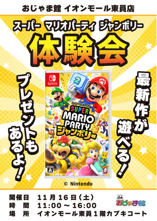 株式会社カジ・コーポレーション(エンターテイメント営業本部:愛知県半田市、代表取締役社長:前川 智範、以下、カジ・コーポレーション)が運営するトレーディングカード・テレビゲーム専門店「おじゃま館 イオンモール東員店」は、2024年11月16日(土曜日)にて、任天堂株式会社のNintendo Switch(TM)用ソフト「スーパー マリオパーティ ジャンボリー」の体験会イベントを開催いたします。