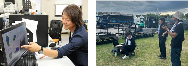 吉田教授は2023年にFM802と「オトヂカラプロジェクト」を発足させ、アーティストや聴衆が大音量の音を会場で楽しめ、なおかつ住民の環境も守る「適切な音」を探りたいと、万博記念公園で開催する野外フェスの音について調査研究するようになりました。フェス当日にステージから100m間隔で音の大きさや高さを計測し、スピーカーの種類や設置場所、楽曲の周波数特性による影響などを調べています。会場内外での音の伝わり方や適切な音響レベルの上限値を見いだすことから、多くの野外フェス会場での音響設定への活用を目指しています。