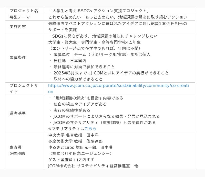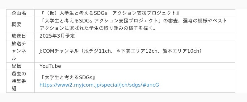 JCOM株式会社(J:COM、本社:東京都千代田区、代表取締役社長:岩木 陽一)は、次世代のチャレンジ支援の一環として、全国の大学生から “これから始めたい・もっと広めたい、地域課題の解決に取り組むアクション”を募集し、J:COMが実行サポートする「大学生と考えるSDGs アクション支援プロジェクト」を実施しています。