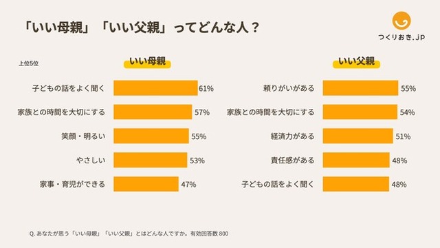 「あなたが思う『いい母親』『いい父親』とはどんな人ですか」という質問に対し、母親・父親の双方に共通して「家族との時間を大切にする」「子どもの話をよく聞く」という特徴が挙がりました。