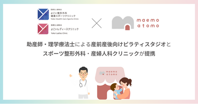 株式会社maemo atomo(大阪府吹田市、代表取締役:西山夏実)が運営する助産師・理学療法士による産前産後向けピラティススタジオ「maemo atomo studio」は、医療法人健裕会 よこい整形外科 健康スポーツクリニック(大阪府豊中市、院長 横井 裕之)、よこいレディースクリニック(大阪府豊中市、院長 横井 恵理子)と提携を結び、産前産後の方がより安心して運動に取り組める環境づくりを目指します。