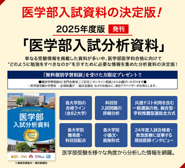 株式会社リソー教育(本社:東京都豊島区、代表取締役:天坊真彦)の子会社である、株式会社名門会(本社:東京都豊島区、代表取締役:吉田信司)は、「無料個別学習相談」を受けた方限定で2025年度版「医学部入試分析資料」を先着順にて無料プレゼントいたします。