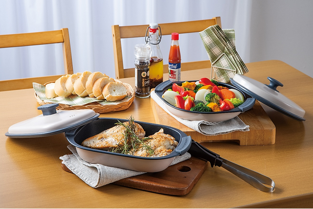 焼き魚も簡単!1台7役で様々な調理が可能 掃除が手間となるグリルを使わなくても、外はカリっと、中はふっくらジューシーな焼き魚が簡単に作れます。約430g(丸形は480g)と軽量で、形状は丸形と角型の2種類をご用意。ご自宅の電子レンジの形状に合わせてお使いいただけます。