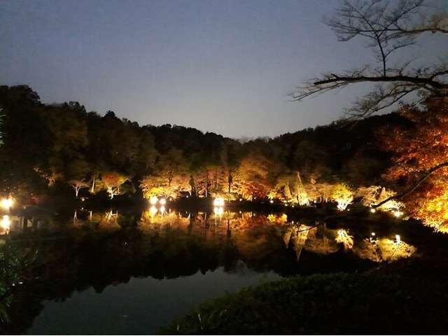 薬師池の幻想的なライトアップが魅力