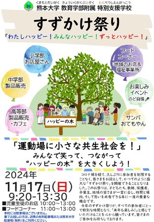 本校では下記の日程にて、学校行事「すずかけ祭り」を実施します。「すずかけ祭り」は、日頃の学習成果を発揮する場として、小学部は、各学級でゲームコーナー等のお店屋さんを実施します。中学部と高等部は、自分たちで作ったクラフト製品や陶工製品、縫工製品の作業製品を販売したり、クッキーやコーヒー等のテイクアウトカフェを実施したりします。昨年度までは、新型コロナウイルスの影響により、お客様の呼びかけを縮小していましたが、本年度は、黒髪4町内の地域の方々や近隣の小中学校、高齢者施設等へも呼びかけ、地域の方々との交流や啓発もすずかけ祭りの目的の1つとして開催します。