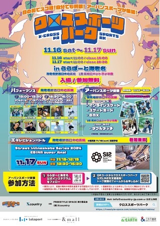 株式会社Xcountry(本社:東京都豊島区)が主催する人気アーバンスポーツイベント「クロススポーツパーク」が、2024年11月16日(土)・17日(日)に三井ショッピングパーク ららぽーと海老名(以下、ららぽーと海老名)で開催される。今回のイベントでは、ダブルダッチ、インラインスケート、スケートボード、BMXの4種目が集結し、参加者は無料で各競技を体験できる。