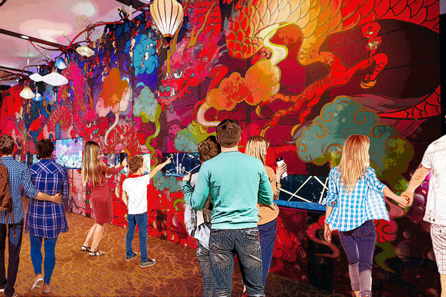 花と金魚、昇龍伝説を連想させる幻想的な空間。それはまさに戦国乱世と華やかな新しい文化が交差する、ここでしか体感できない五感を刺激する作品です。
