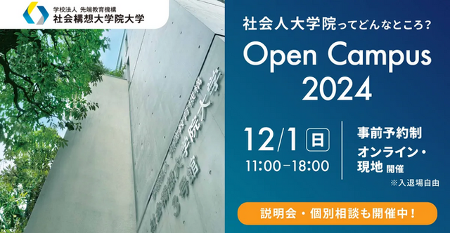 社会人向け総合専門職大学院の社会構想大学院大学(東京都港区、学長:吉國浩二)は、3研究科の体験授業、座談会、個別相談会に参加できるオープンキャンパスを12月1日(日)開催致します。