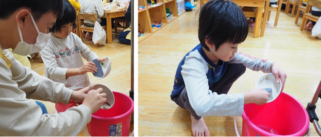 また、にじいろ保育園中野野方では、幼児クラスの子どもたちが給食後にスケッパーを使用し自分たちで皿を綺麗にしてから給食室に返却する活動を行っています。廃油石鹸を用いることで水を汚さず、自主的に環境に優しい行動を実践するなど、環境意識がさらに高まる効果も生まれています。