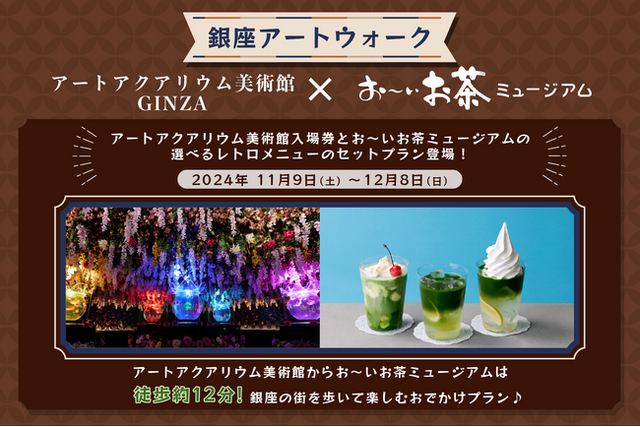 アートアクアリウム美術館 GINZA(所在地/銀座三越)では、お~いお茶ミュージアムカフェ(港区東新橋1丁目5-3)とのコラボプランを11月9日(土)~12月8日(日)の期間限定で開催いたします。