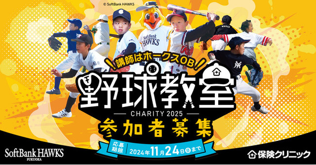 福岡ソフトバンクホークス2024年オフィシャルスポンサーの保険ショップ『保険クリニック(R)』は、2025年1月11日(土)に雁の巣レクリエーションセンター 「多目的グラウンドA」 (福岡県福岡市)にて開催する、今年で8回目の小学生向けチャリティ野球教室の参加者を募集します。当日はホークスジュニアアカデミーコーチたちが子どもたちへ指導します。また、当日頂いた参加費の全額を、「認定NPO法人日本クリニクラウン協会」へ寄付いたします。