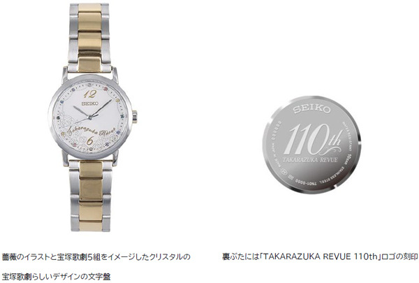 数量限定で発売する当商品は、文字盤には薔薇のイラストをあしらい、インデックスには、宝塚歌劇の5組をイメージしたカラーがキラキラと輝くクリスタルガラスを採用しました。また、裏ぶたには宝塚歌劇110th ロゴを刻印し、細部にまでこだわったエレガントかつ繊細なオリジナルデザインです。