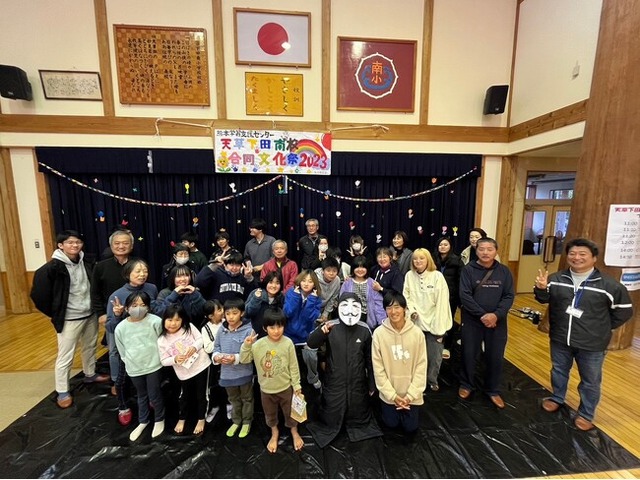2023年度の天草下田南合同文化祭の記念写真に写る熊本学習支援センターの生徒、地域の方、地域の子どもたち