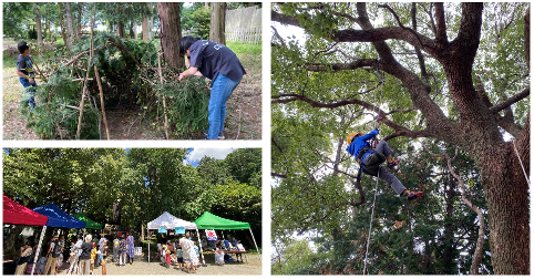 鎮守の森で「木登り」を実施。神社の高い木にロープを使って登る、ここでしかできない体験。