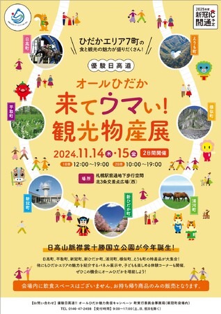 高規格道路日高自動車道新冠IC(仮称)の開通を見据えて、利用者の多くを占める札幌圏の方々の誘客推進を図るため、魅力あるひだか地域7町の特産品の販売や日高自動車道の整備効果と日高山脈襟裳十勝国立公園を紹介するパネル展示のほか、アイヌの伝統工芸「イタ」の製作実演販売及びアイヌ文様入ペンダントの組立やVRを用いたジョッキー体験などの体験コーナー、観光PRなど、オールひだかで魅力を伝える観光物産展を開催します。