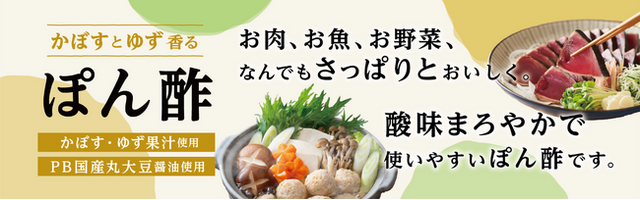 「かぼすとゆず香るぽん酢」はその名の通りかぼすとゆずの柑橘果汁を使用し、柑橘を混合し配合する事で香料は使用せず、香り豊かに仕上げました。柑橘果汁との相性がたいへん良い、販売中のPB国産丸大豆醬油を味のベースとして使用しています。