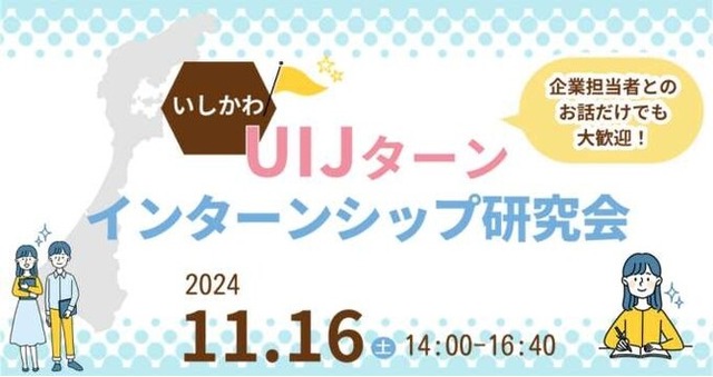 県外で在学中の学生の方向けに、2024年11月16日(土)に東京・京都の二会場にて「いしかわUIJターンインターンシップ研究会」を開催いたします。