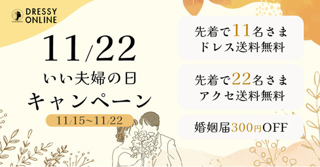 「PLACOLE & DRESSY」ブランドを展開する、冒険社プラコレ(本社:神奈川県鎌倉市、代表取締役CEO:武藤功樹)は、11月22日「いい夫婦の日」に合わせ、運営するECサイト「DRESSY ONLINE」にて期間限定 特別キャンペーンを実施いたします。